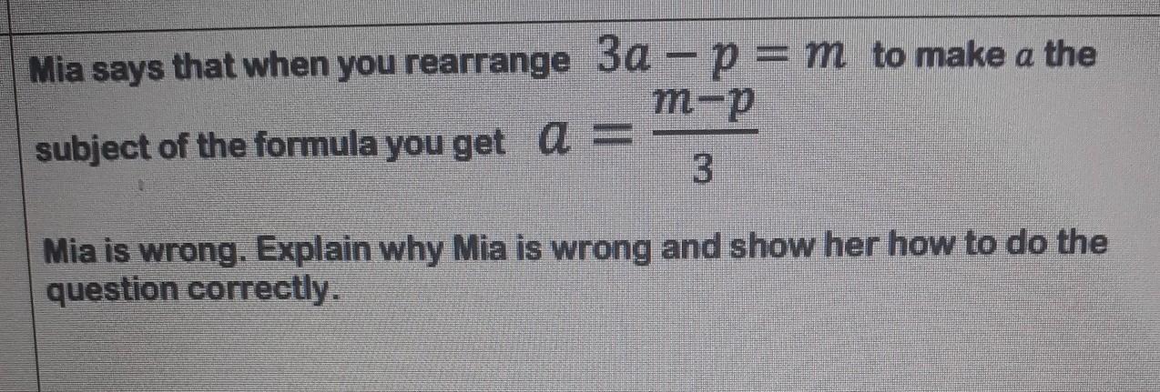 Mia says that when you rearrange 3a - p = m to make a the subject of the formula you get: