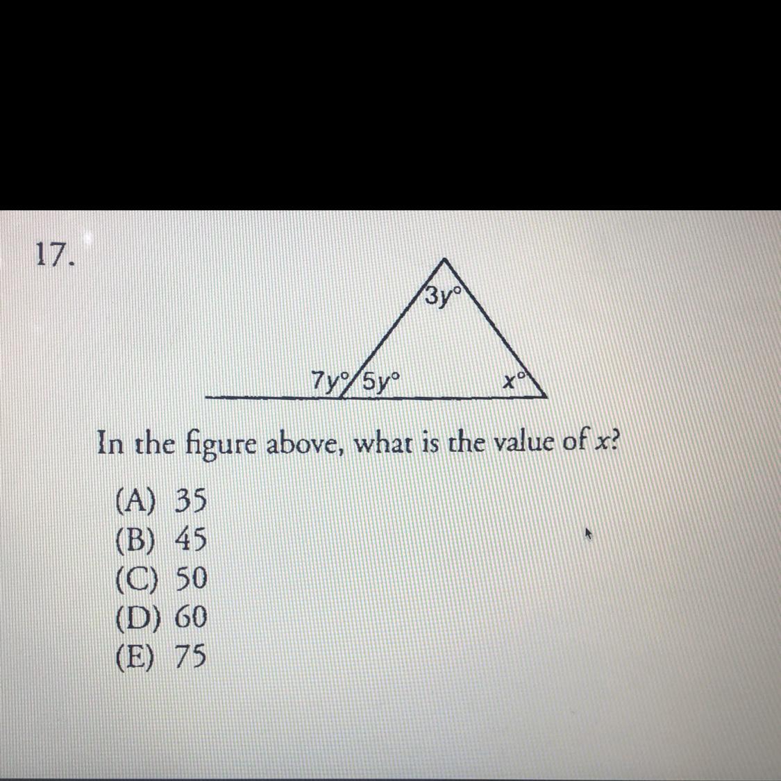 Remember that the sum of the interior angles of a triangle is 180°. To do it the easier (but longer) way, simply do the following. Add all the interior angles up, and subtract it from 180 to get the angle you do not know, and then solve for angle 1: