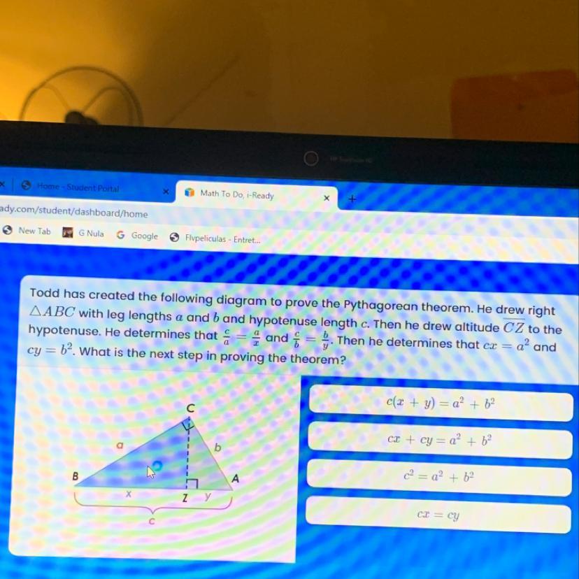tenuse length c. Then he drew altitude CZ to the hypotenuse. He determines that c/a=a/z and c/b=b/y. Then he determines that cx=a^2 and cy=b^2. What is the next step in proving the theorem?