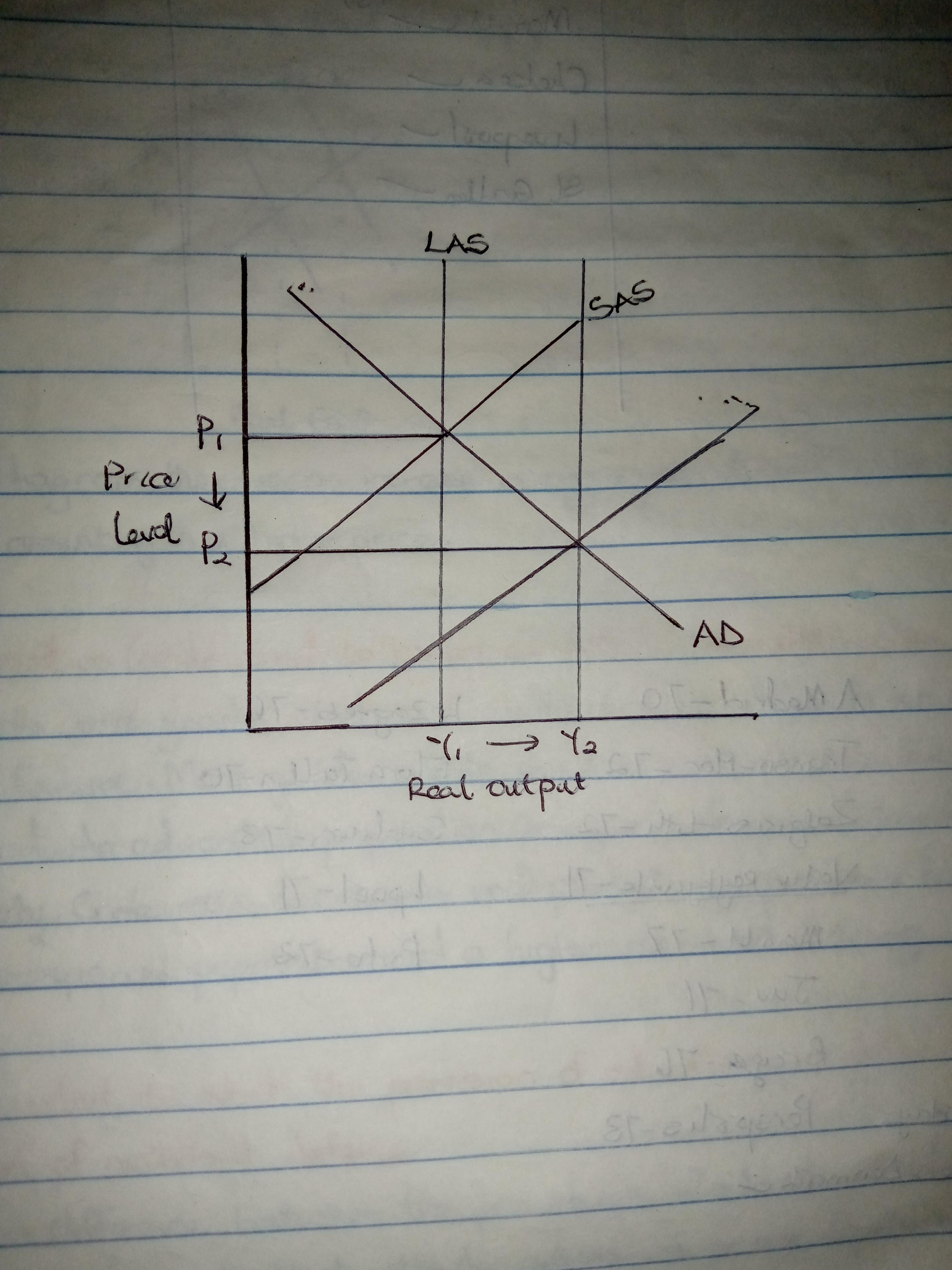 Answer: The price level falls and output rises.