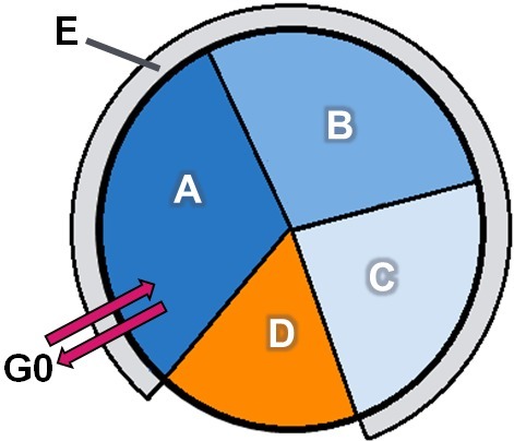 Label A - G1 phase ; the cell experiences rapid growth and metabolic activity Label B- S phase - DNA synthesis and replication takes place, Label C- G2 phase- the cell is preparing for division. Label D - mitosis- which involves cell and cytoplasmic division Label E- Interphase, this is the stage of growth and metabolic activity and occupies most of the cell cycle.