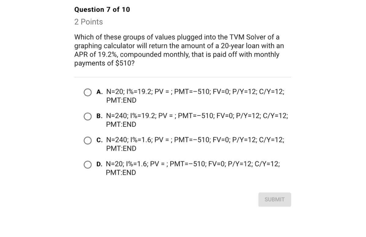 N=240;I%=19.2;PV=;PVT=-510;FV=0;