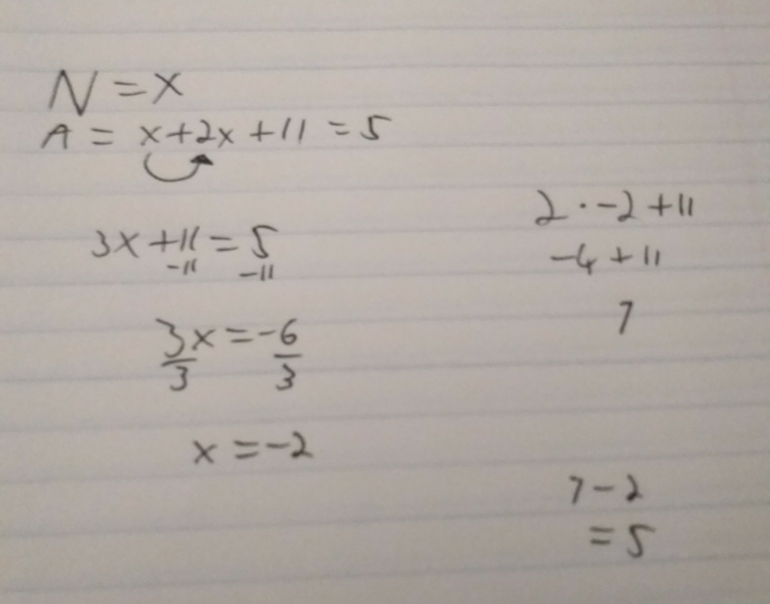 So from the word problem, we know that Alex's number is 11 more than twice your number. (2*-2+11) = 5.