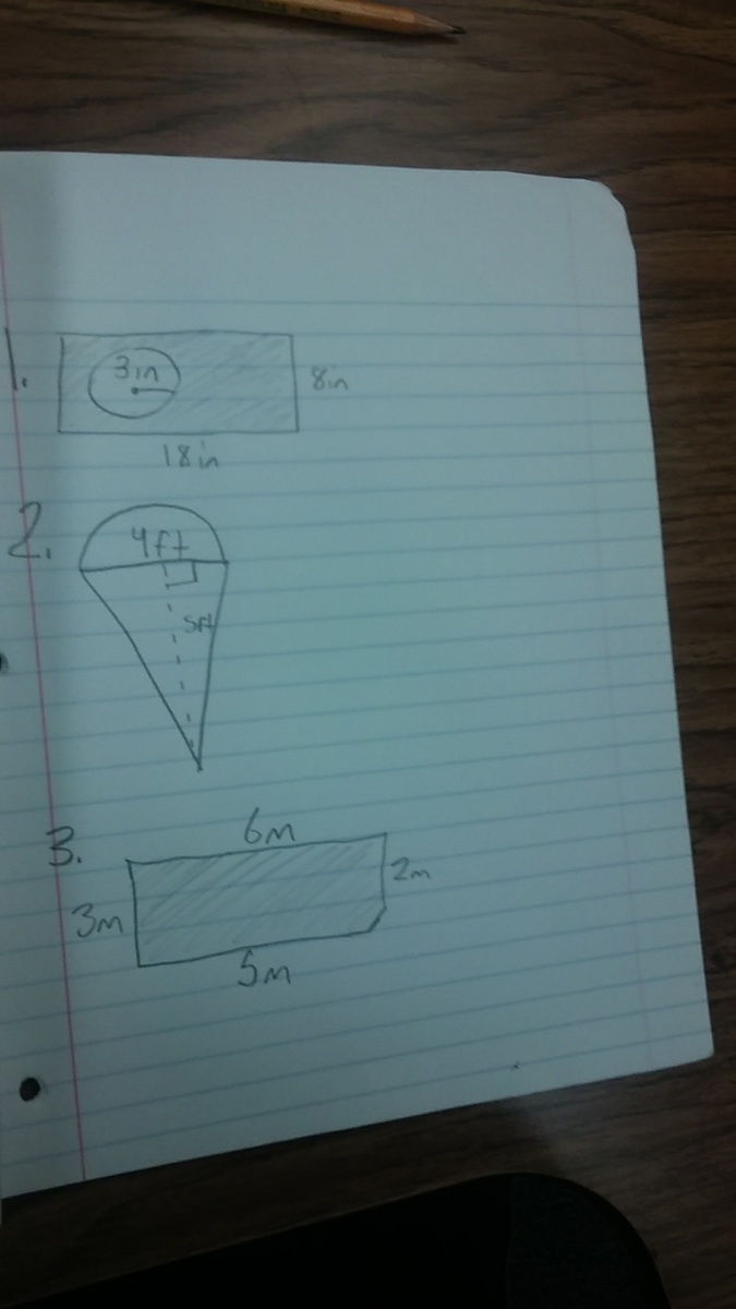 The area of the first one would be the area of the rectangle minus the area of the circle, so 18*8 - (pi*3*3). That's equal to around 115.7257 inches squared.