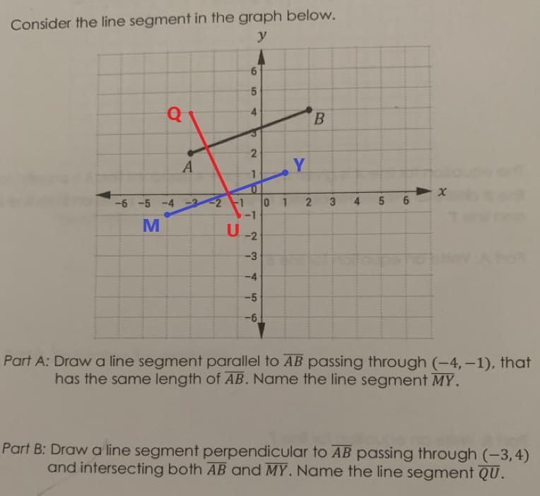 5. Consider the line segment in the graph below. Part A: Draw a line segment parallel to AB passing through (-4,-1), that has th
