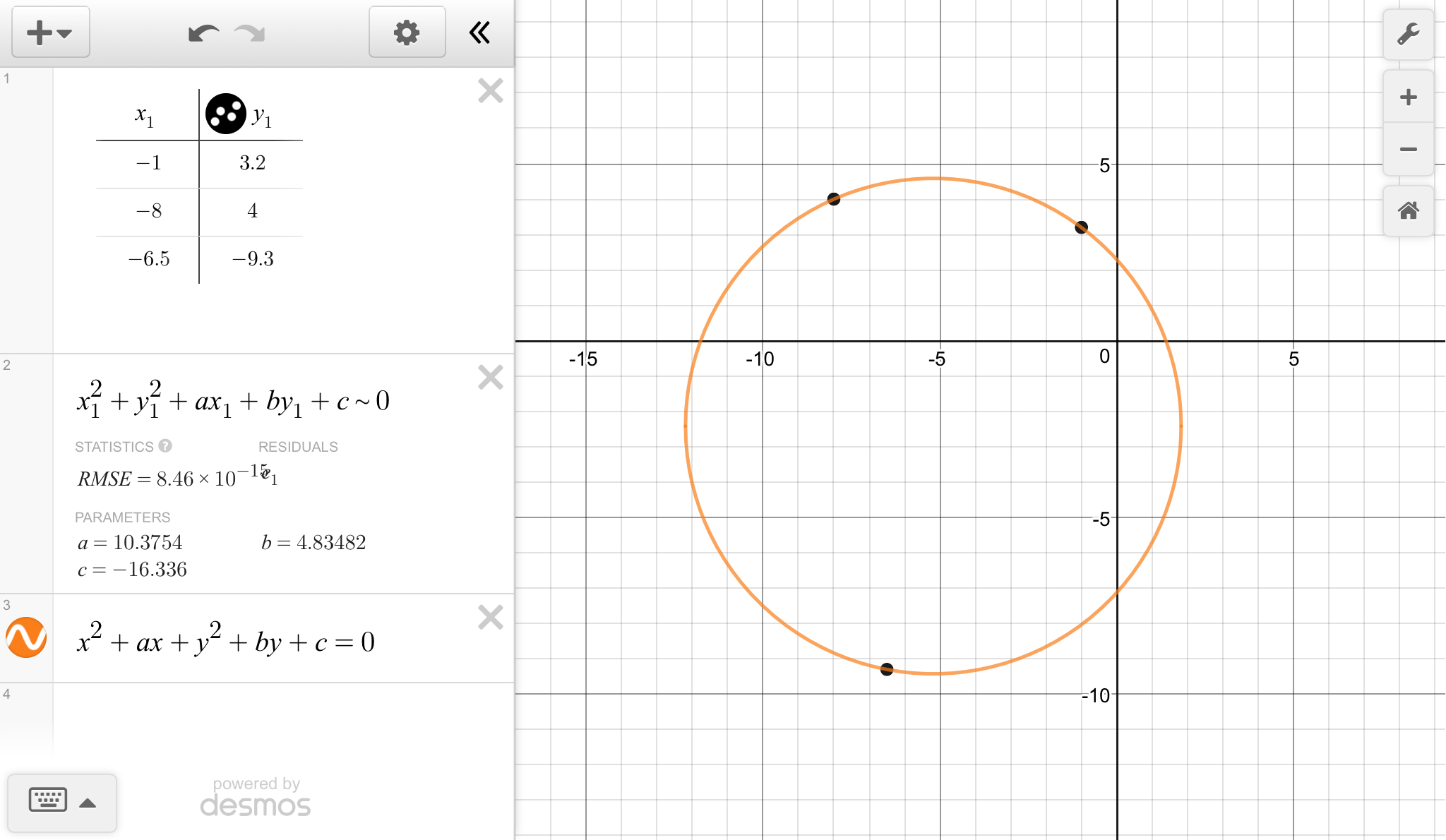 ... (-6.5)² +(-9.3)² + (-6.5)a +(-9.3)b +c = 0