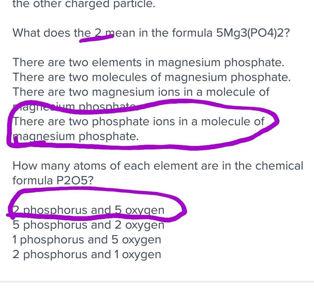 From the given formula of compound we conclude that, the subscript 2 means there are two phosphate ions in a molecule of magnesium phosphate and the subscript 3 means there are three magnesium ions in a molecule of magnesium phosphate.