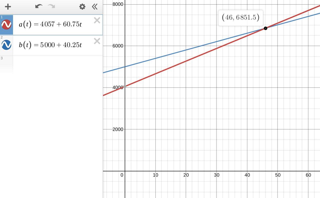 y = 5000 +40.25(46) = 5000 +1851.5 = 6851.5