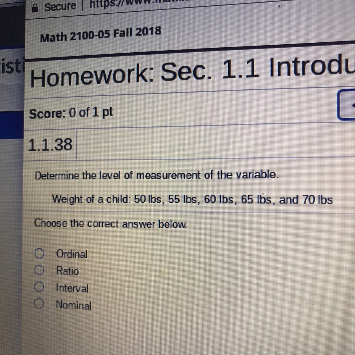 Determine the level of measurement of the variable. Weight of a child: 50 lbs, 55 lbs, 60 lbs, 65 lbs, and 70 lbs