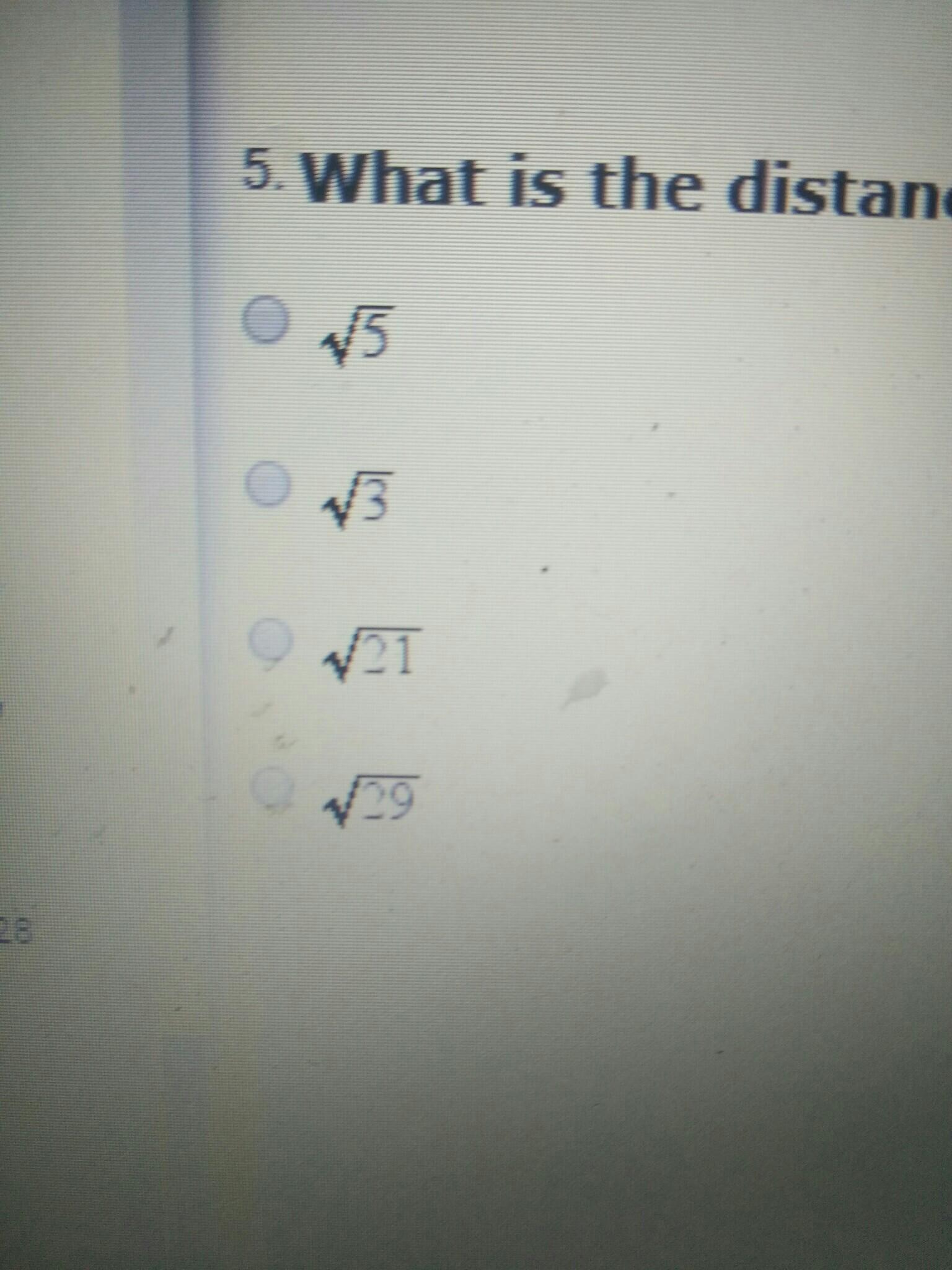 The answer is the root of 29 since the distancebetween the points is the hypothenuse(or however spelled) of a right angled triangle. the change in y and change in x make the other 2 sides. the vhange in x is 5 and the change in y is 2 therefore the distance between the points is the root of 5 squared plus 2 squared which is 25+4=29