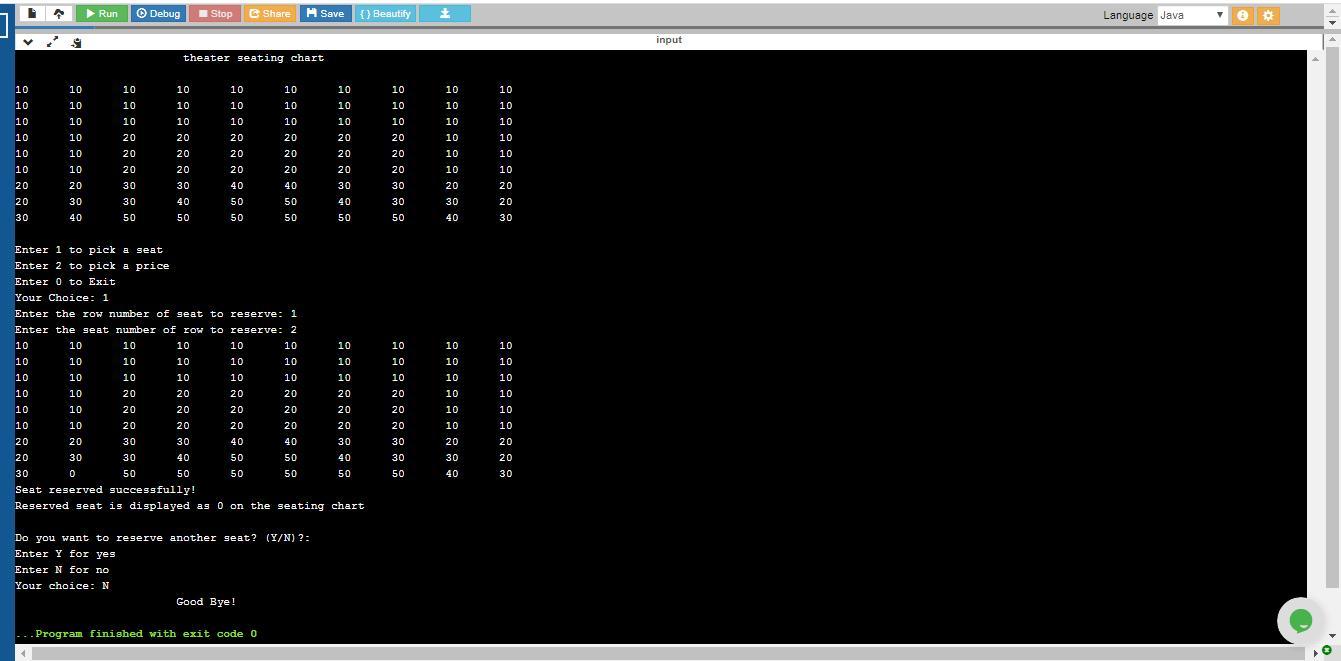methods to implement seat allocation: When a user specifies a seat (row, column), make sure it is available. When a user specifies a price, find any seat with that price. Write appropriate responses to the user if the seat is already taken, if their seat is available, or the seat number of the assigned seat if they just specified a price, etc.