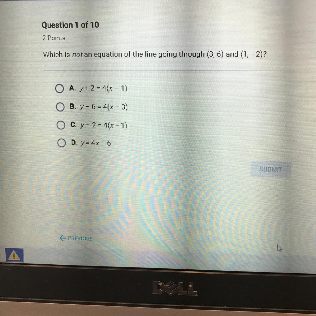 If we use the point (1, -2), then y + 2 = 4(x - 1). This matches A. Thus, A is one form of the equation of the line going thru (3,6) and (1,-2), and so A is not the correct answer to the problem you have posted.