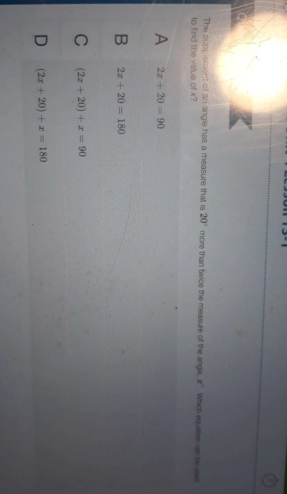 the cemetery of an angle has a measure of 20 degrees more than twice the measure of the angle X degrees which equation can be us