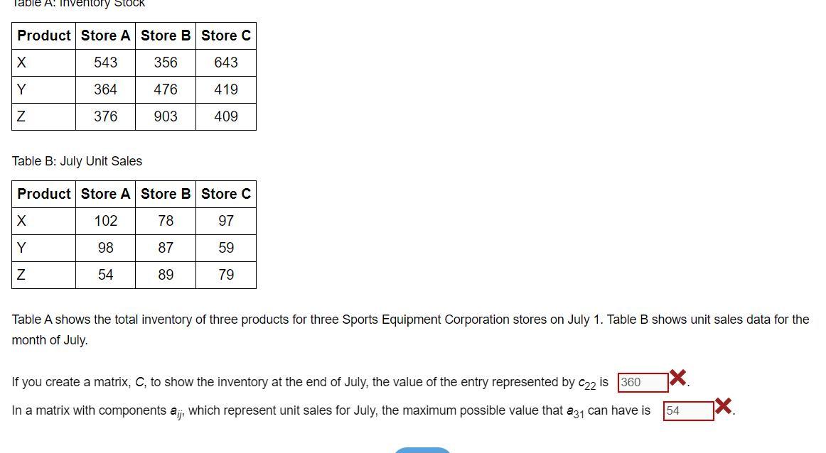 a) The value in C22 is the amount of inventory Store B has of Product Y at the end of July. That value is the starting inventory, 476, less July sales, 87, so will be ...