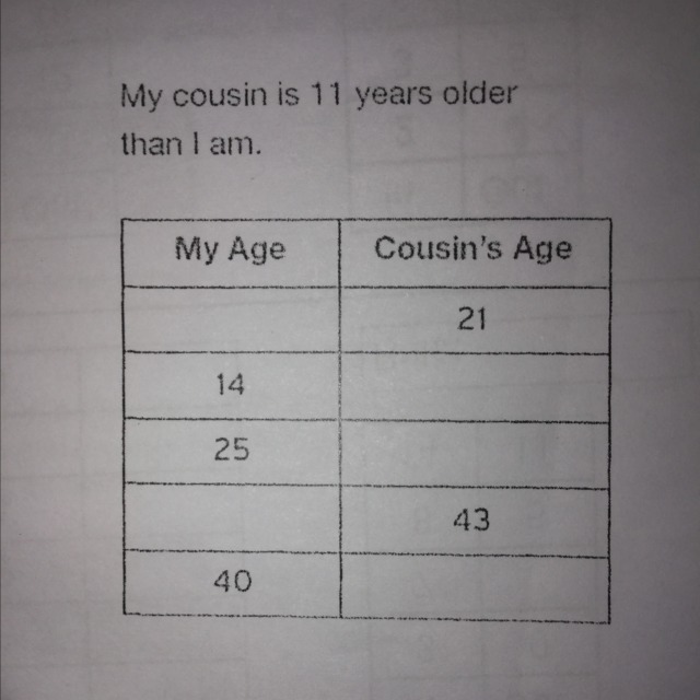 For the left side of the chart you would have to add 11 since his cousins age will always be 11 years more than his. For the right side of the chart you would subtract 11 since his age is always 11 less than his cousins. For the first row, 21 - 11 = 10, so you would fill in 10 For the second row, 14 + 11 = 25, so you would fill in 25. Etc, etc.