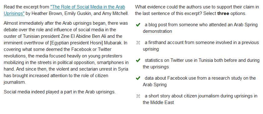 This is the one with pick three options. The last sentence, "Social media indeed played a part in the Arab uprisings. ", is the conclusion and is the main idea of this. The answers all include social media.
