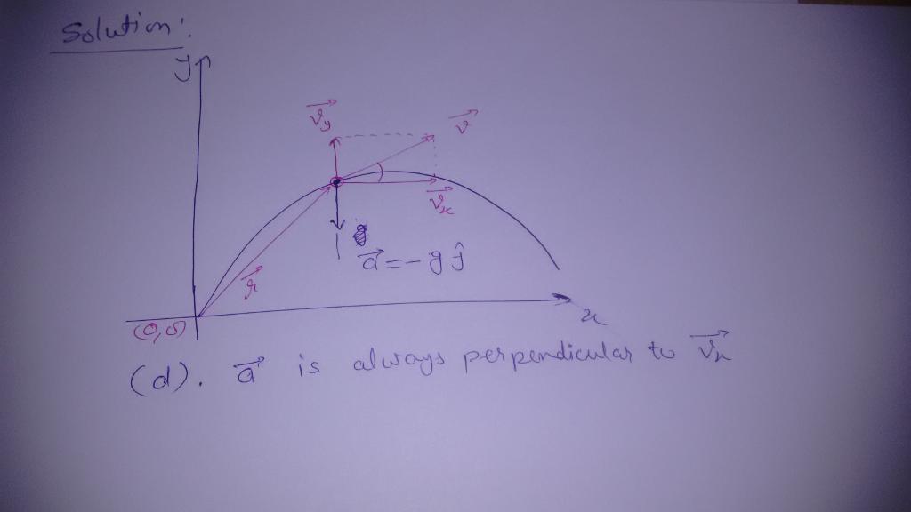 The only force acts on a projectile is gravitational force {F<em>g</em>}, therefore its acceleration a=F<em>g</em>/m will always directed towards the direction of force i.e. vertically downwards. Therefore it will always be perpendicular to the x direction or here we can say that a is always perpendicular to Vx}.