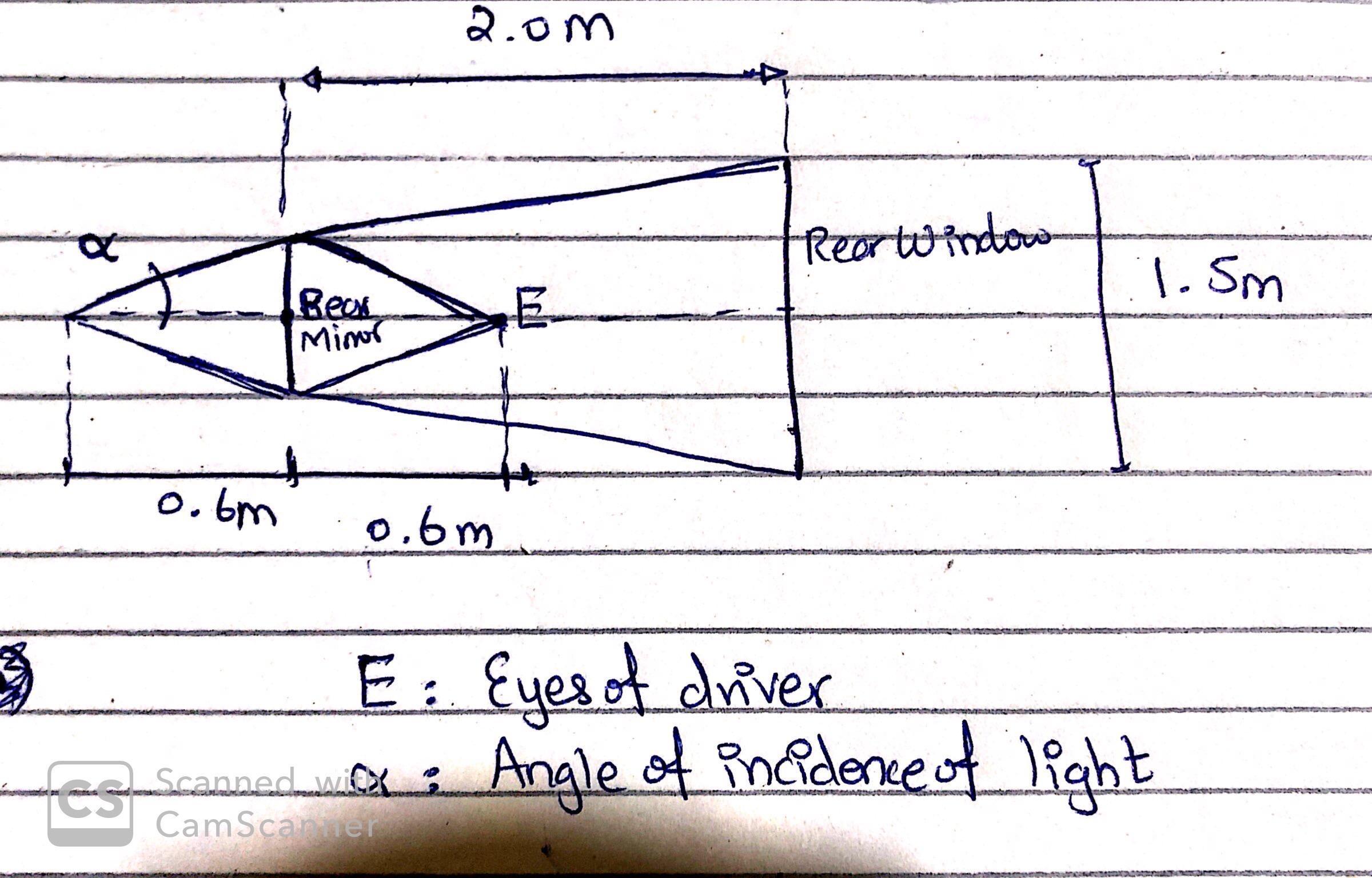 - As per the attachment first thing we need to calculate is the angle of incidence of light "α" reflected from the rear view mirror to the eyes of the driver.