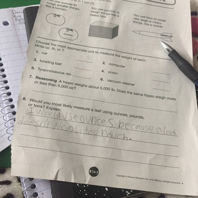 #7. Q. A hippo weighs about 5,000 lb.. Does the same hippo weigh more or less than 5,000 oz.?