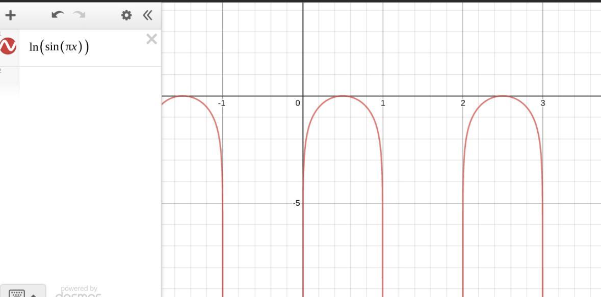 The function is only defined where sin(πx) is positive, so x will be between 0 and 1 (not inclusive). The pattern repeats for (2, 3), (4, 5), (6, 7), and so on.
