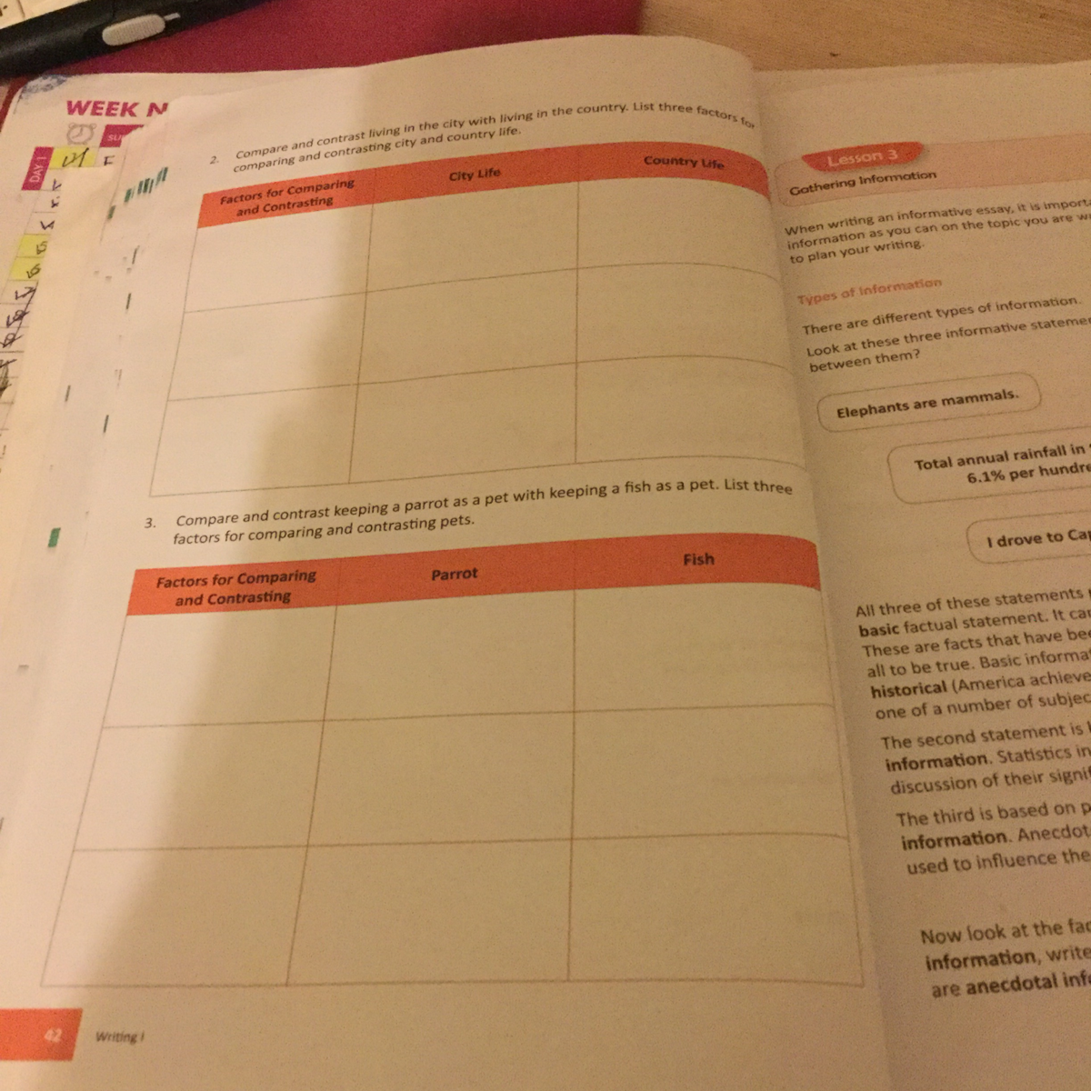 Well, in the country,there are many animals, whereas in the city, there are very few animals. In the city, there are many shops and stores, while in the country there are few or none. In the city, there are offices, while in the country, many are self-employed. A parrot can fly, and a fish can swim. A parrot can talk, a fish cannot. Finally, a fish is less intelligent than parrots. Hope this helps!