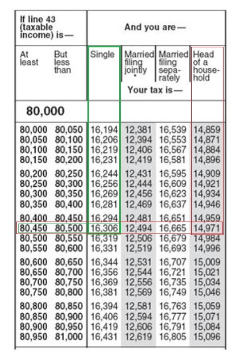 Given that Jarrod's filing status on last year's tax return was single, while Paige's was Head of Household. If both head taxable incomes of $80,456. Now we need to find about how did the amount's of taxes they paid compare according to the table given below.