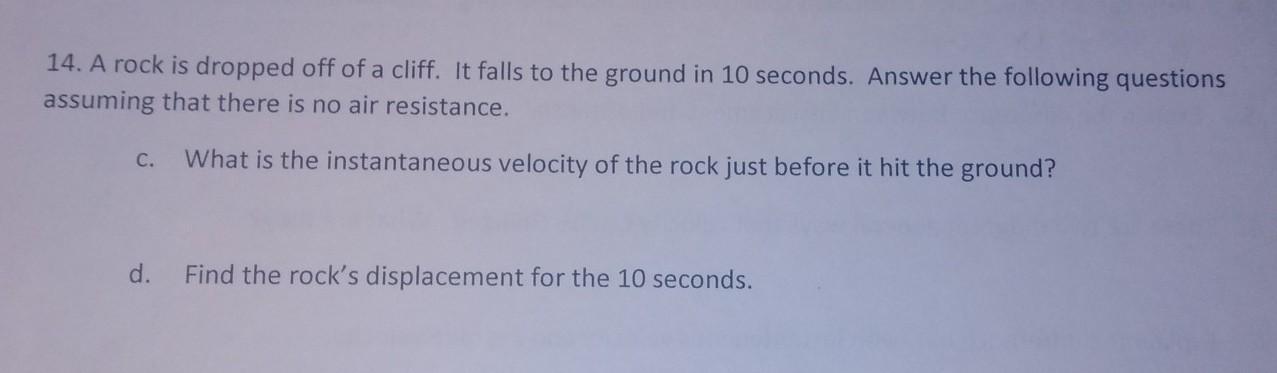 The motion of the rock is a uniformly accelerated motion (free fall) with constant acceleration g=-9.8 m/s^2 (negative since it is downward). Therefore, we  can find its velocity using the following suvat equation