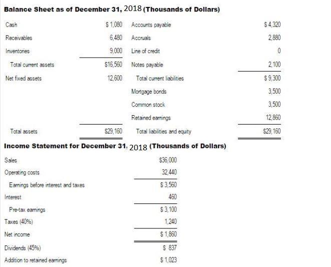 balance sheet and income statement for December 31, 2019. The interest rate on all debt is 9%, and cash earns no interest income. Assume that all additional debt in the form of a line of credit is added at the end of the year, which means that you should base the forecasted interest expense on the balance of debt at the beginning of the year. Use the forecasted income statement to determine the addition to retained earnings. Assume that the company was operating at full capacity in 2018, that it cannot sell off any of its fixed assets, and that any required financing will be borrowed as notes payable. Also, assume that assets, spontaneous liabilities, and operating costs are expected to increase by the same percentage as sales. Determine the additional funds needed. Do not round intermediate calculations. Round your answers to the nearest dollar.