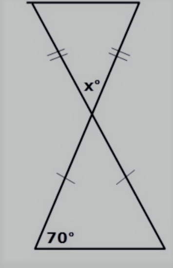 Short answer: x = 40 Remark All you are concerned about is the bottom triangle. It is isosceles, so the two base angles are equal. You are 1 step away from finding x.