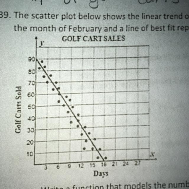 The Scatter plot below shows the linear trend of the number of golf carts a company sold the month of February and a line of bes