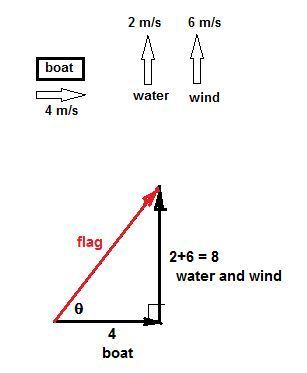 The velocity diagram adds the speed of the boat (due east) as a vector to the combined speed of the water and the wind (due north) to obtain the velocity of the flag, at an angle θ, counterclockwise from the eastern direction.