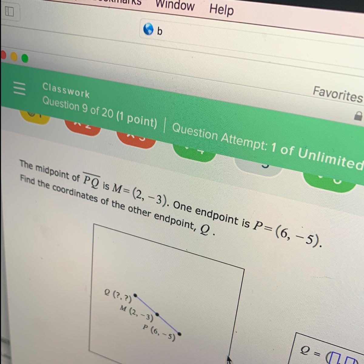 The x coordinates of A and B are 9 and -1 in that order. Add them up to get 9+(-1) = 9-1 = 8. Then divide by two to end up with 8/2 = 4. The midpoint has an x coordinate of 4.