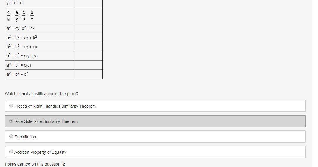 right triangles BDC and CDA. CD measures h units, BD measures y units, DA measures x units. The following two-column proof with missing justifications proves the Pythagorean Theorem using similar triangles: Statement Justification Draw an altitude from point C to Line segment AB Let segment BC = a segment CA = b segment AB = c segment CD = h segment DB = x segment AD = y y + x = c c over a equals a over y and c over b equals b over x a2 = cy; b2 = cx a2 + b2 = cy + b2 a2 + b2 = cy + cx a2 + b2 = c(y + x) a2 + b2 = c(c) a2 + b2 = c2 Which is not a justification for the proof? Pieces of Right Triangles Similarity Theorem Side-Side-Side Similarity Theorem Substitution Addition Property of Equality