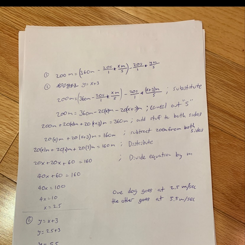 One dog goes at 2.5 meters per second. The other one goes at 5.5 meters per second.