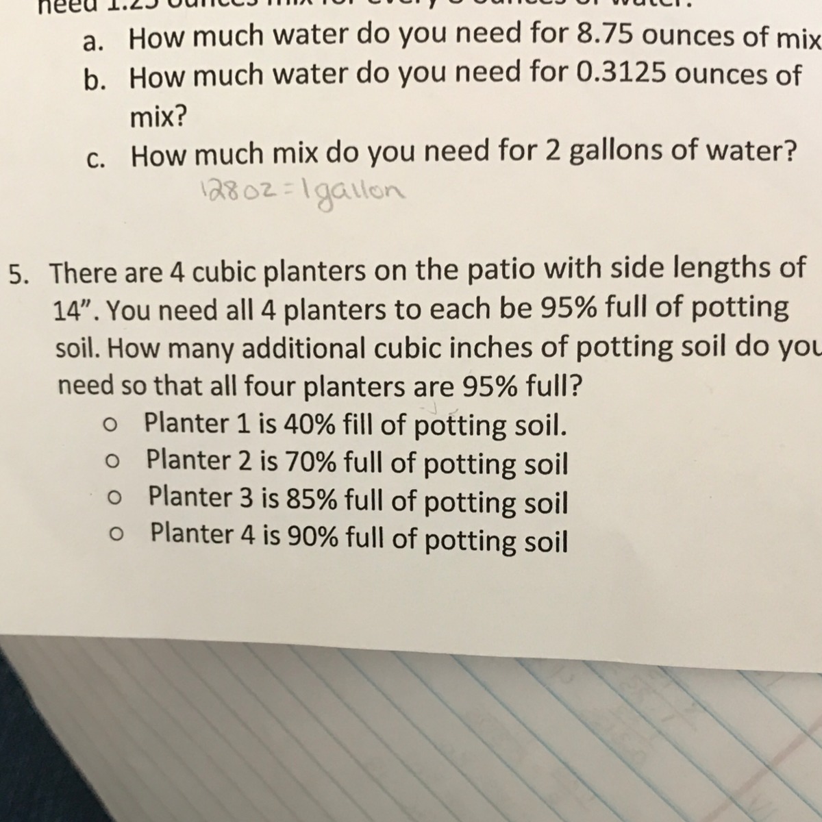 Planter 1 = 2,744 * .40 = 1,097.6 cubic inches in it. 2,606.8 - 1,097.6 = 1,509.2 still needed.