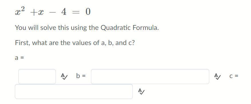 The quadratic formula is x=\frac{-b+/-\sqrt{b^2-4ac} }{2a}. Here a=1, b=1, and c=-4.