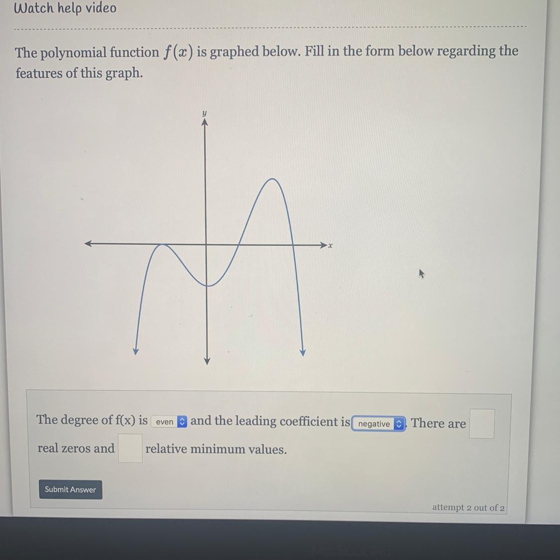 The degree of f(x) is even, and the leading coefficient is negative. There are 3 real zeros, and 1 relative minimum values.
