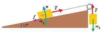Now we can set the more complex Newton's second law for the net force acting on the x-axis for this block. Pointing towards the pulley (direction of the resultant acceleration a), we have the string's tension (T). Pointing in the opposite direction we have two forces: the force of friction (<em>f</em> ) with the plane, and the x-axis component of the block's weight (weight1 times sin(12)):