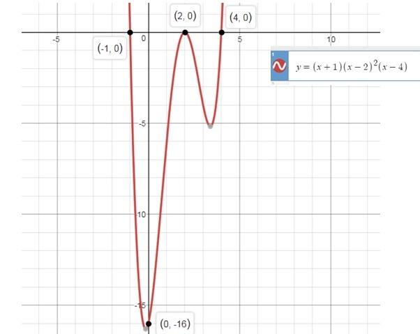 Here, the roots are -1, 2, 4. (∵ as the graph crosses or touches x-axis or y=0 line)