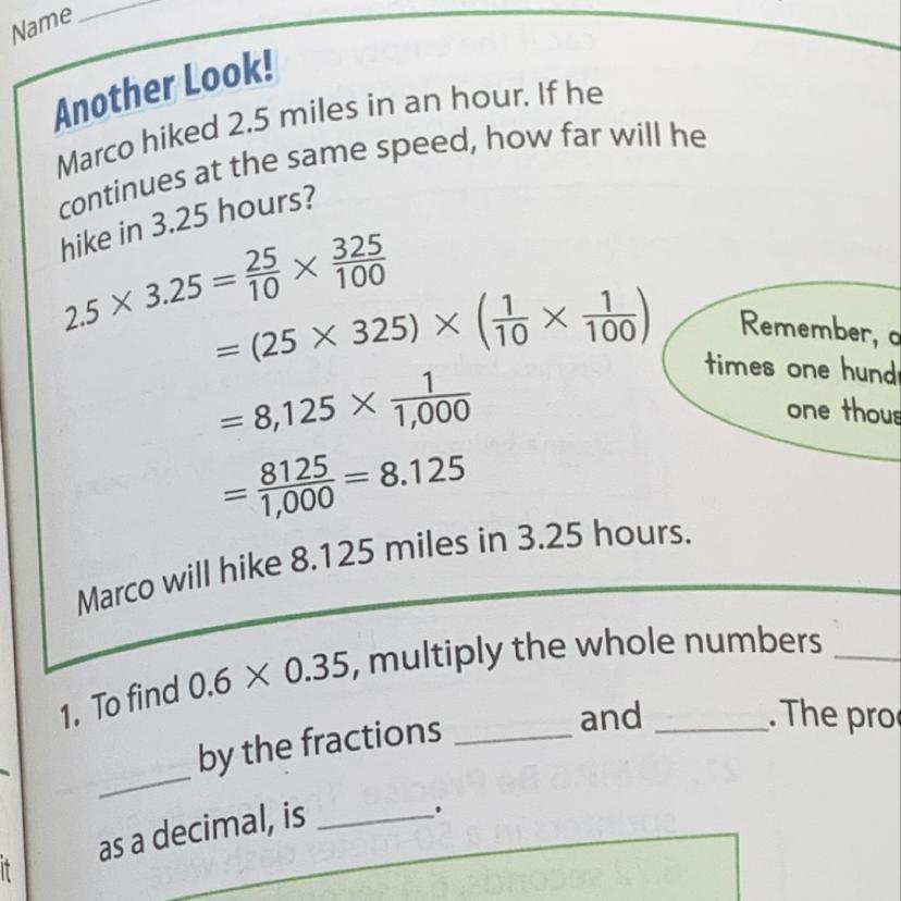 To find 0.6 x 0.35, multiply the whole numbers____ and____ by the fractions____ and____. The product, written as a decimal is___