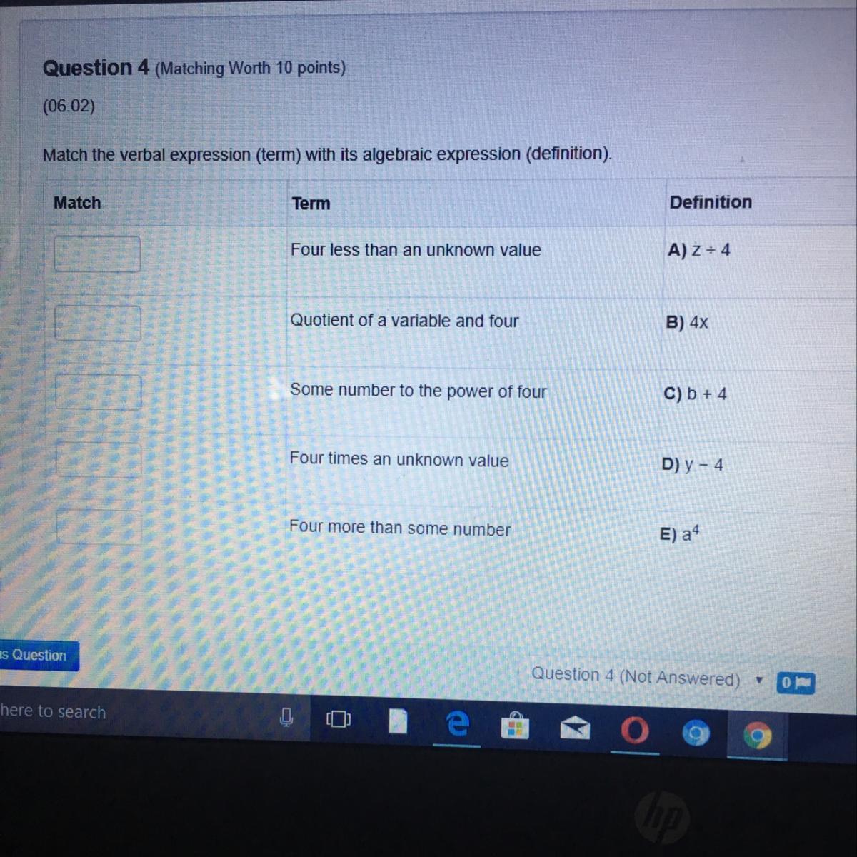 Quotient of a variable and four: A