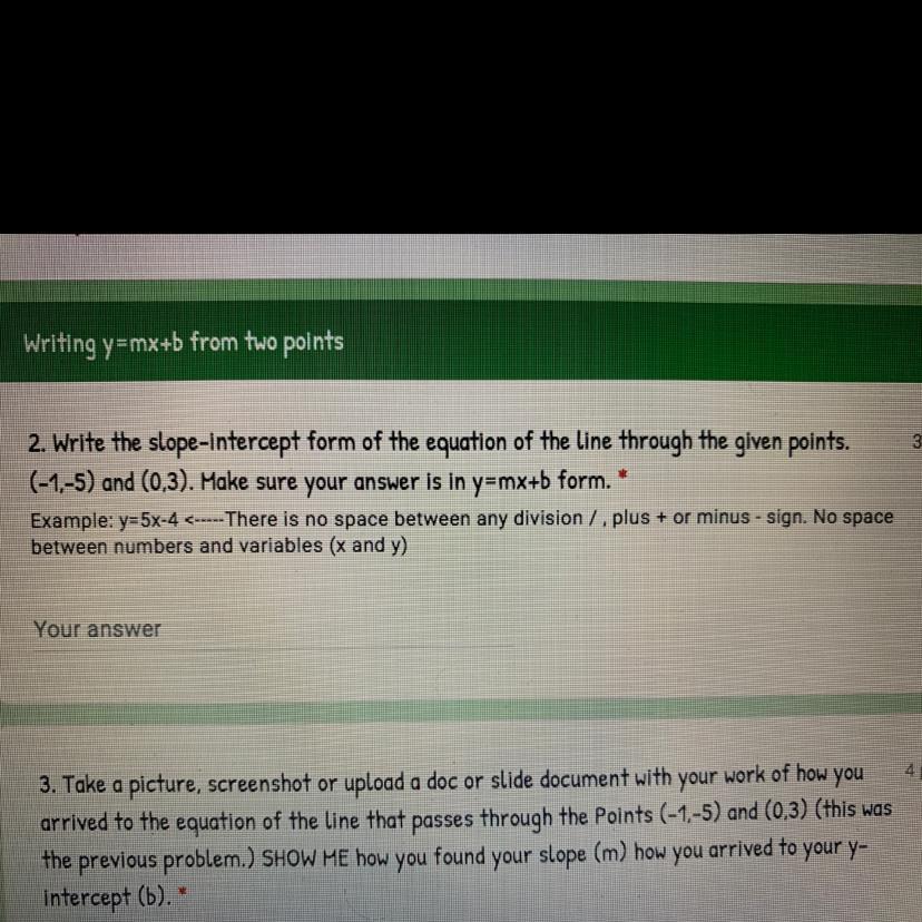 (3 - (-5)) / (0 - (-1)) = 8 / 1 = 8. Therefore our answer is y = 8x + 3. Hope this helps!