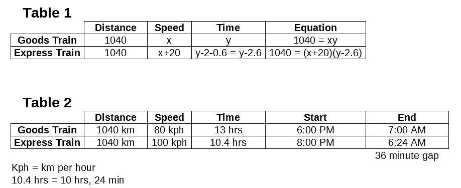 If the goods train travels 1040 km and does so at a speed of 80 km/hr, then it travels for 1040/80 = 13 hours. Add this onto 6:00 PM and we arrive at 7:00 AM. This is shown in the first row of table 2 (see below).