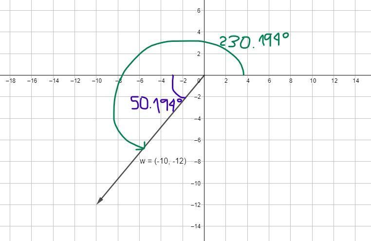 ![\begin{gathered} w=❬-10,-12❭ \\ \Vert w||=\sqrt[]{(-10)^2+(-12)^2} \\ \Vert w||=\sqrt[]{100+144} \\ \Vert w||=\sqrt[]{244} \\ \Vert w||\approx15.620\Rightarrow\text{ The symbol }\approx\text{ is read 'approximately'} \end{gathered}](https://tex.z-dn.net/?f=%5Cbegin%7Bgathered%7D%20w%3D%E2%9D%AC-10%2C-12%E2%9D%AD%20%5C%5C%20%5CVert%20w%7C%7C%3D%5Csqrt%5B%5D%7B%28-10%29%5E2%2B%28-12%29%5E2%7D%20%5C%5C%20%5CVert%20w%7C%7C%3D%5Csqrt%5B%5D%7B100%2B144%7D%20%5C%5C%20%5CVert%20w%7C%7C%3D%5Csqrt%5B%5D%7B244%7D%20%5C%5C%20%5CVert%20w%7C%7C%5Capprox15.620%5CRightarrow%5Ctext%7B%20The%20symbol%20%7D%5Capprox%5Ctext%7B%20is%20read%20%27approximately%27%7D%20%5Cend%7Bgathered%7D)