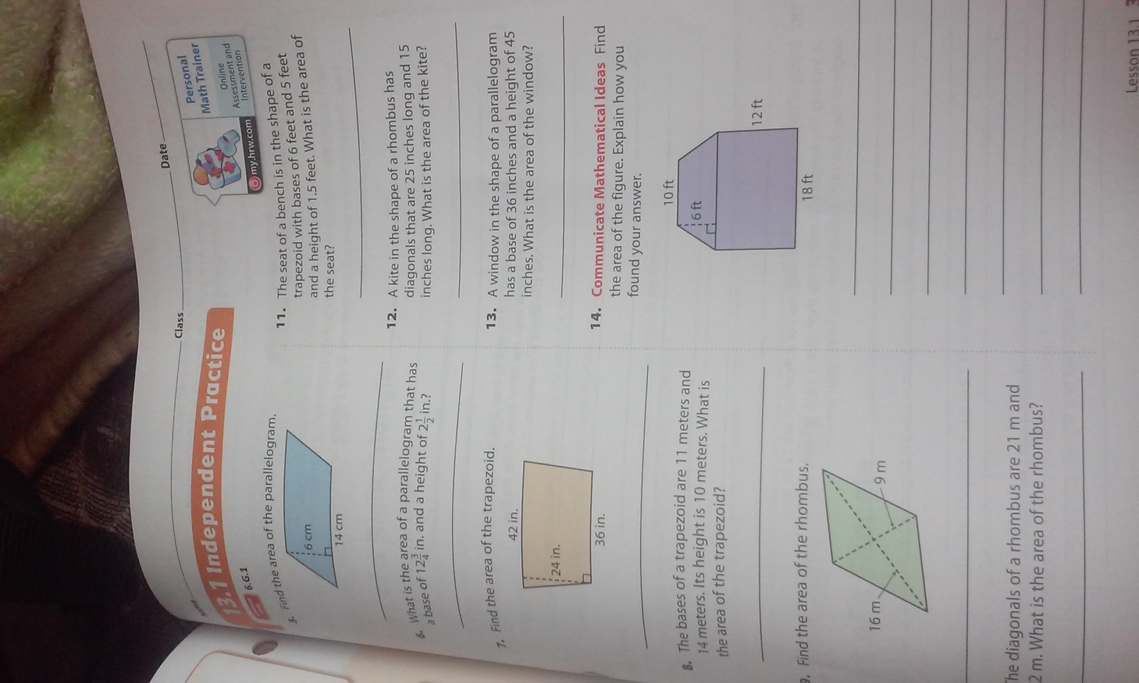 14. 300 squared feet; trapezoid's equation was (10+18)6/2. For the rectangle, equation was 18x12. Add the answers together to get 300.