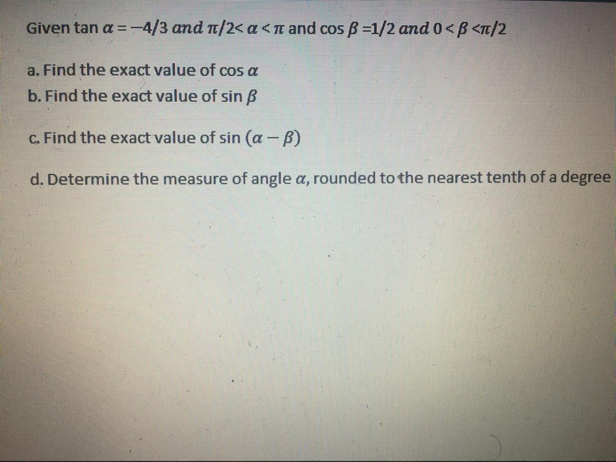 b) This angle is in the first quadrant (where the sine function is positive. They give us the value of the cosine of the angle, so we can use the Pythagorean identity to find the value of the sine of that angle: