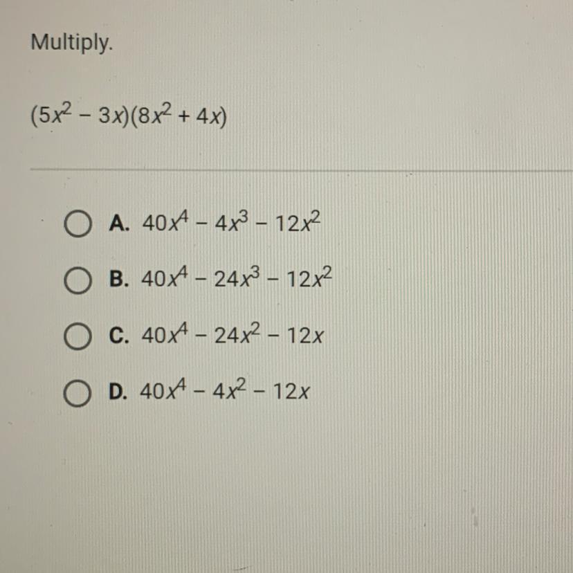 When you multiply (5x² - 3x)(8x²+ 4x), then you will get 40x⁴ - 4x³ - 12x²