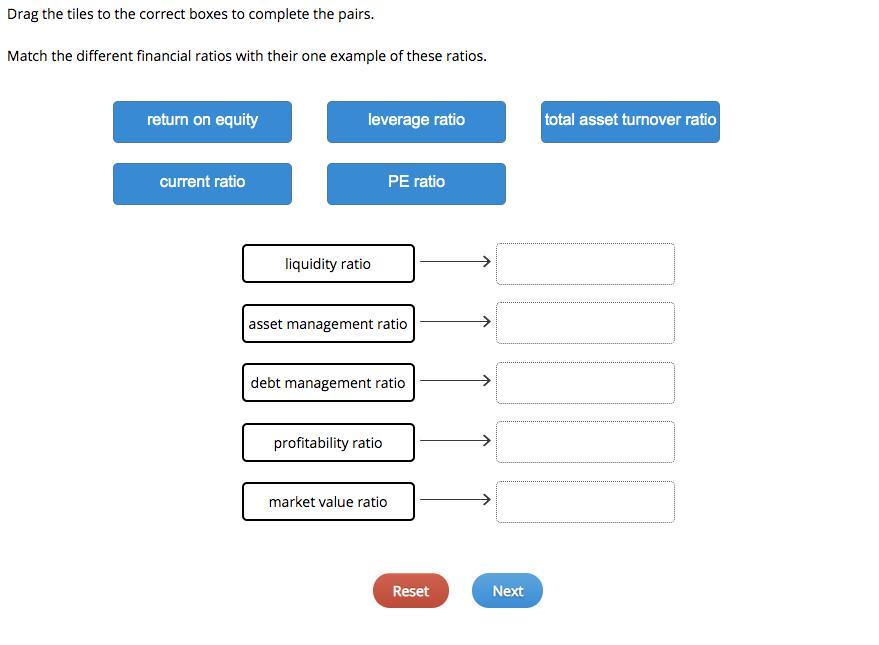 Drag the tiles to the correct boxes to complete the pairs. Match the different financial ratios with their one example of these