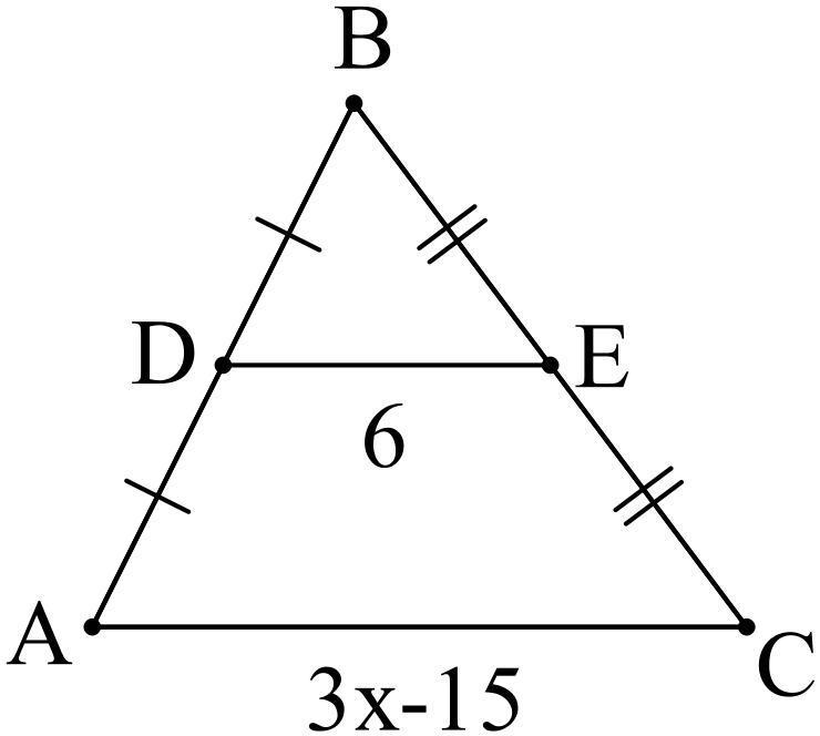 In triangle ABC, D is the midpoint of line AB and E is the midpoint of line BC. If AC= 3x-15 and DE= 6, what is the value of x?