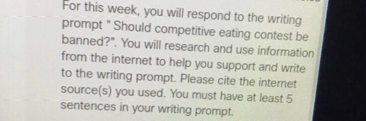 Ok so first things first, its asking you "Should competive eating be banned" so you would either say "yes, i think competive food eating should be banned" or "No, i dont think it should be banned"so its basically like a opinion type thing so find research about competive food eating and tell them why you think or do not think it should be banned.